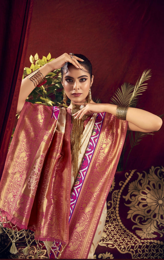 Women Paithani Bansi Cream Saree With Unstiched Blouse