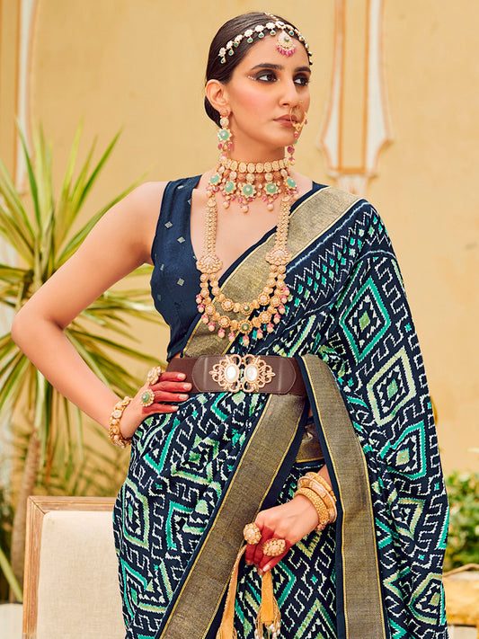 Women's Tussar Silk Navy Blue Printed Designer Saree With Blouse Piece