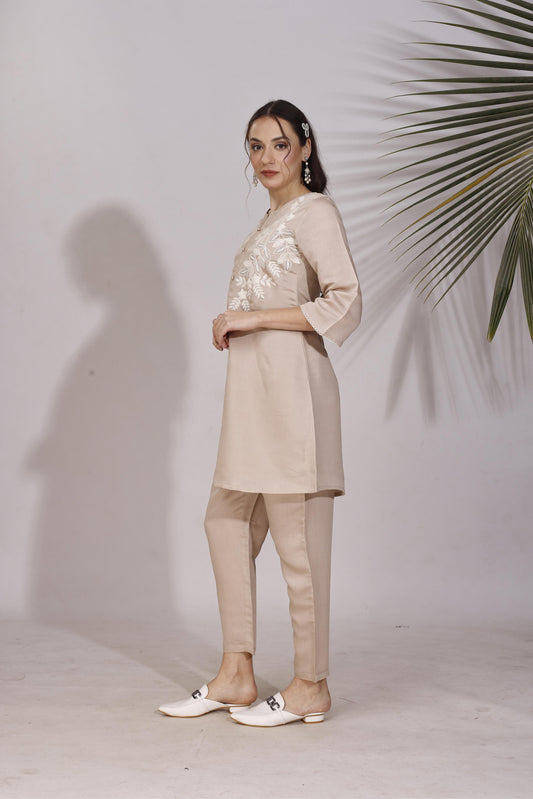 Dhiyona TI Women's Beige Linen Multi Thread Embroidery Flared Kurta with Pant
