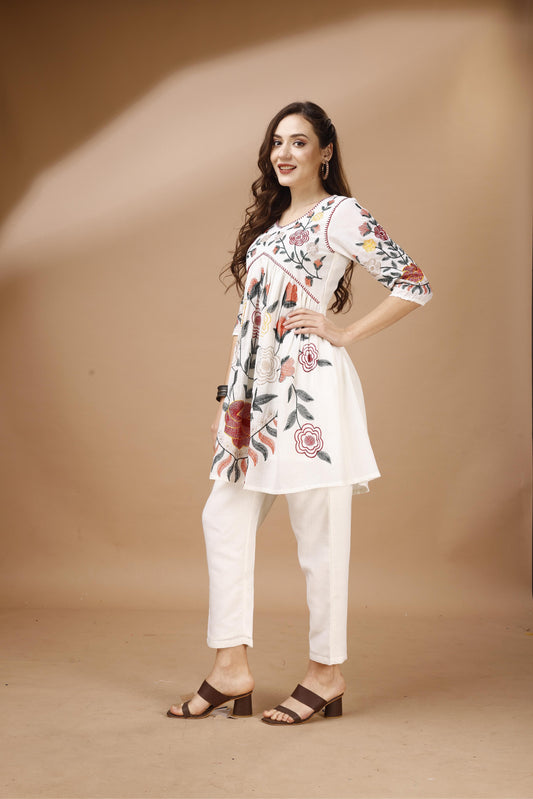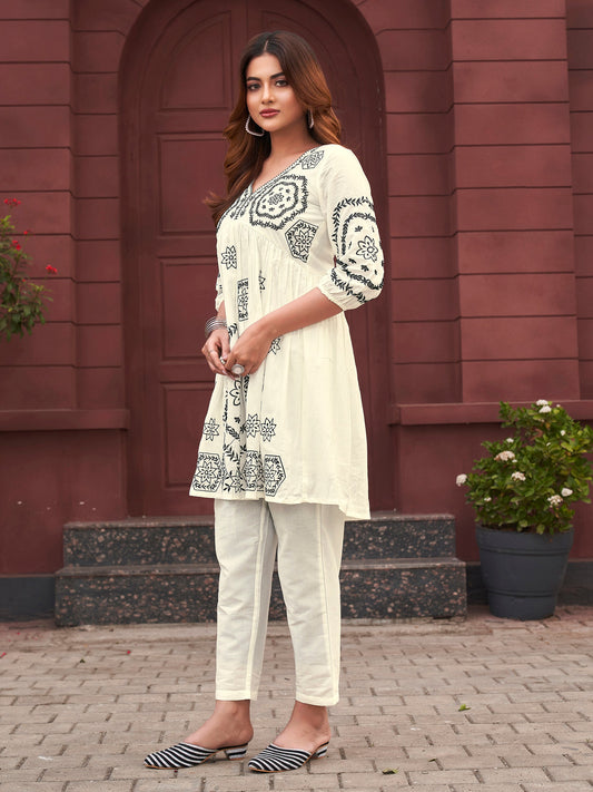 Dhiyona TI Women's Off White Colour Multi Thread Embroidery Flared Co Ord
