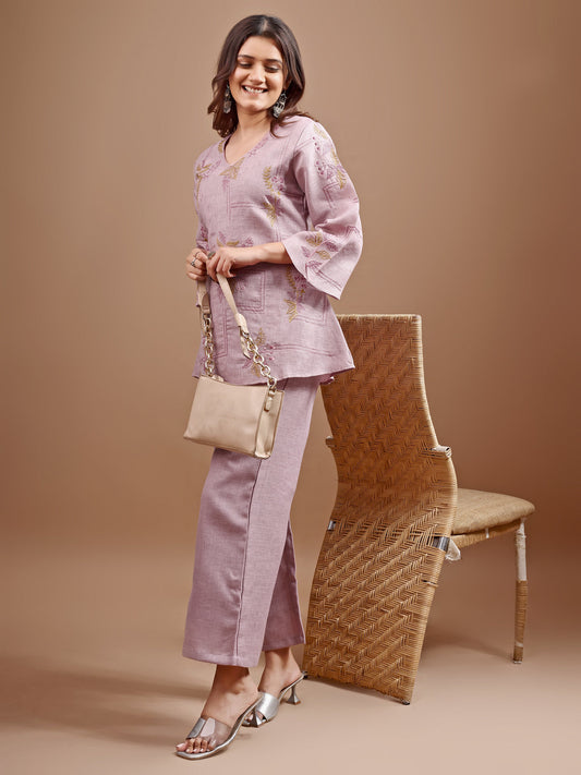 Dhiyona TI Women's Mauve Linen Contrast Thread Embroidery Top with Palazzo