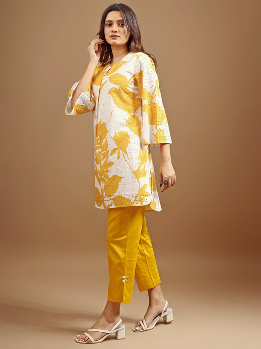 Dhiyona TI Women's Yellow and White Hakoba Printed Kurta with Pant