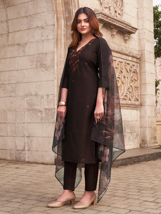 Dhiyona TI Women's Brown Kurta and Pant with Printed Dupatta