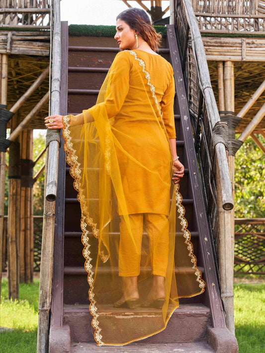 Dhiyona TI Women's Mustard Embroidered Kurta with Net Dupatta