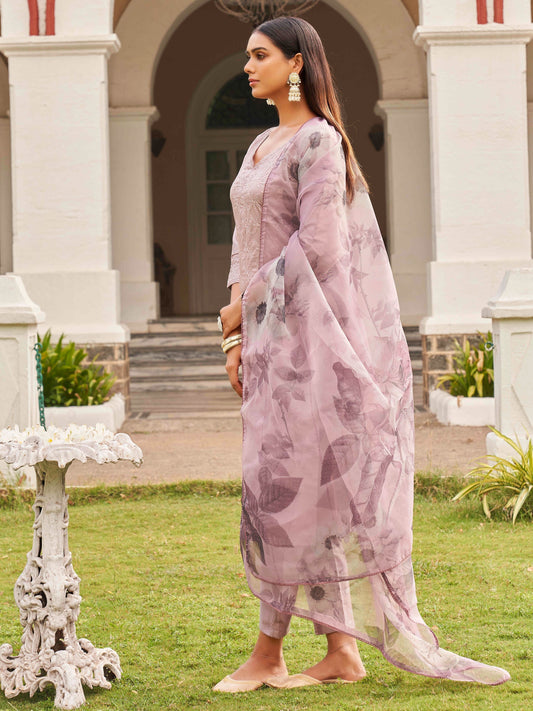 Dhiyona TI Women's Mauve Embroidery Kurta with Organza Dupatta