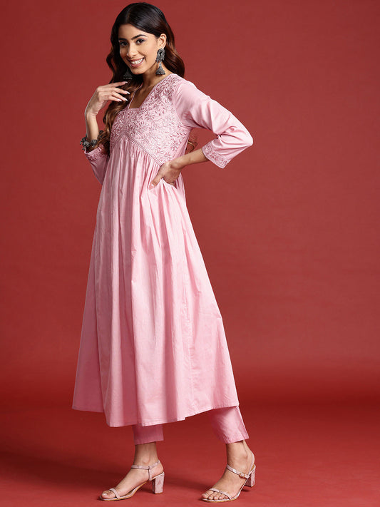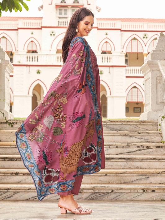 Dhiyona TI Women's Rose Pink Tonal Thread Embroidered Alia Cut Kurta With Pant & Dupatta