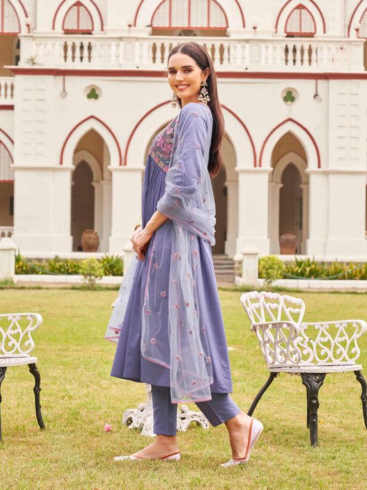 Dhiyona TI Women's Lavender Cotton Blend Multi Flared Alia Cut Kurta with Pant and Dupatta