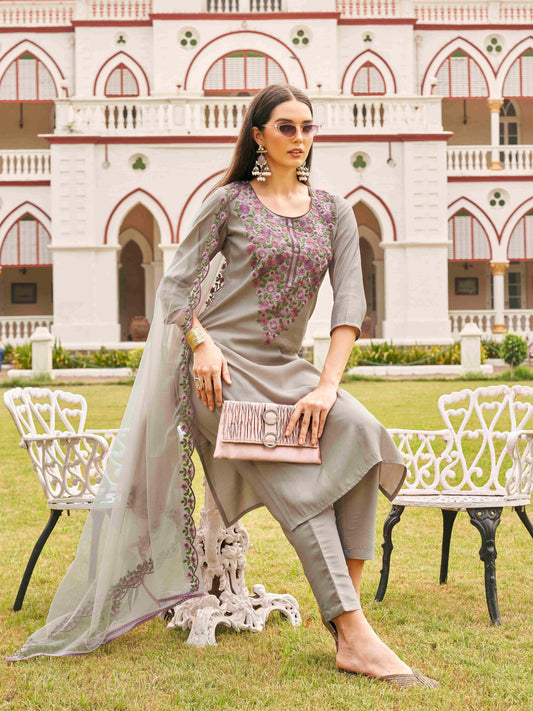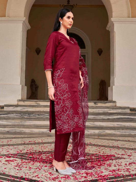 Dhiyona TI Women's Silk Blend Multi Thread Straight Cut Kurta with Pant and Dupatta
