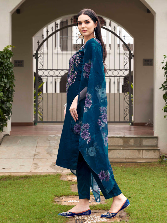 Dhiyona TI Women's Teal Blue Embroidered Kurta and Pants with Dupatta