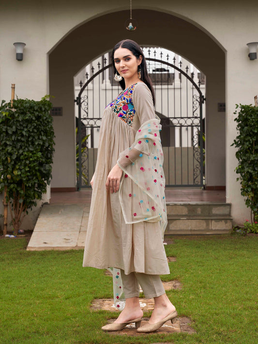 Dhiyona TI Women's Beige Parsi Embroidered Flared Kurta and Pants with Dupatta