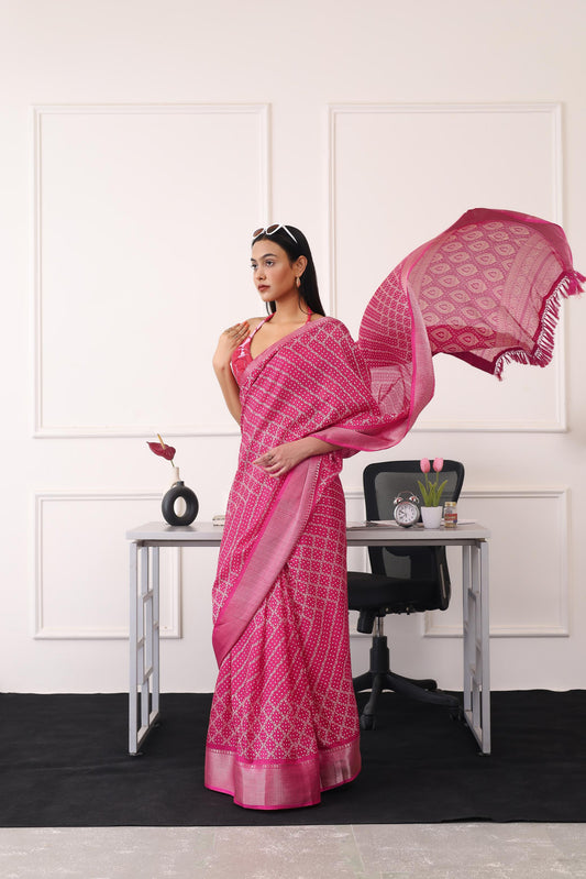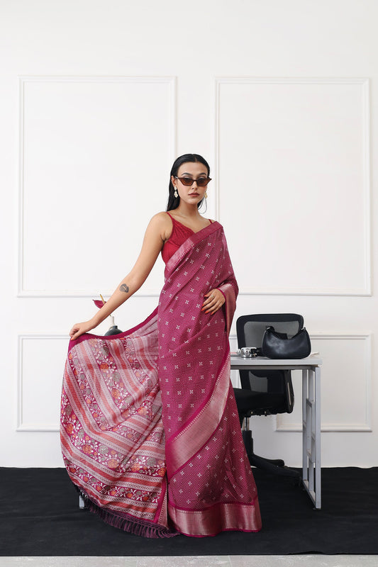 Dhiyona TI Women's Ready To Wear Magenta Printed Saree with Unstitched Blouse