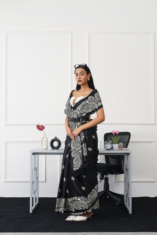Dhiyona TI Women's Ready To Wear Black Colored Printed Satin Saree with Unstitched Blouse