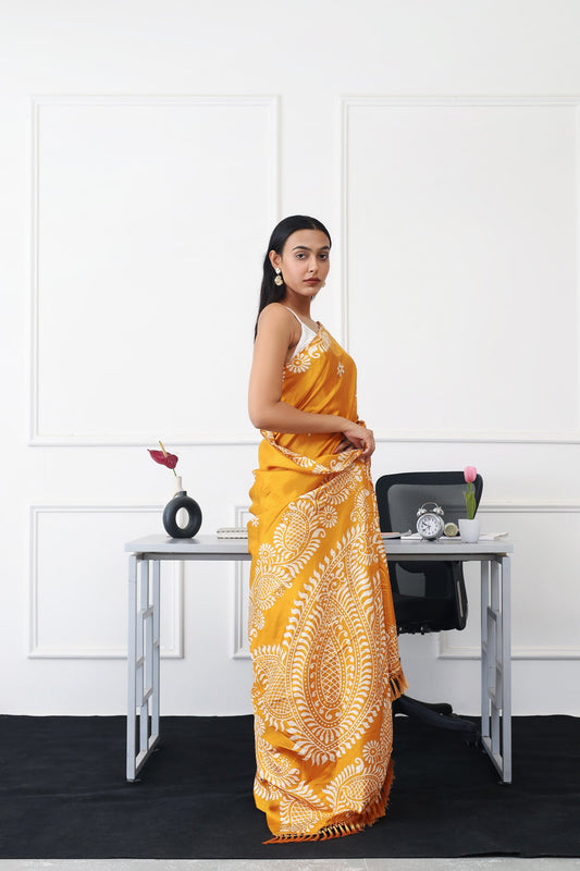 Dhiyona TI Women's Ready To Wear Mustard Colored Printed Satin Saree with Unstitched Blouse