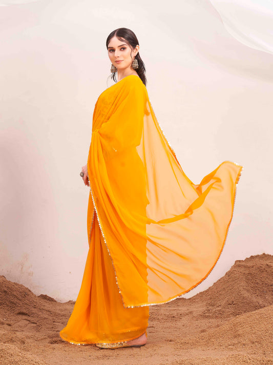 Dhiyona TI Women's Yellow Colored Poly Georgette Saree with Unstitched Blouse and Belt