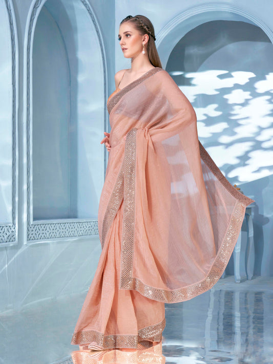 Dhiyona TI Women's Peach Sequined Embroidered Crunchy Saree with Unstitched Blouse