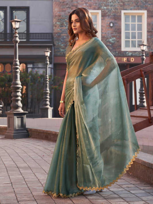 Dhiyona TI Women's Firozi Colored Net Embellished Saree with Unstitched Blouse