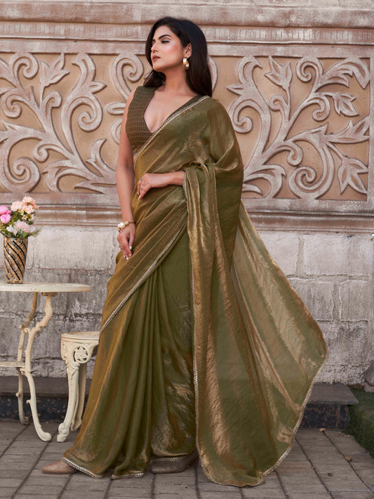 Dhiyona TI Women's Olive Green and Gold Jimmy Lace Saree with Unstitched Blouse