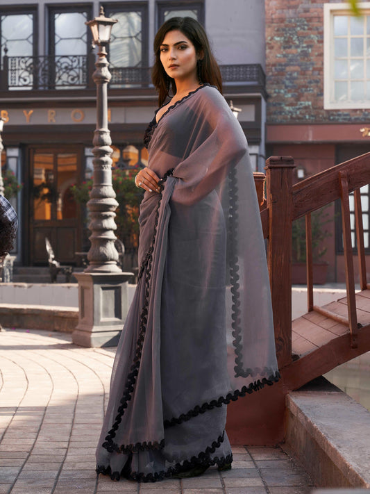 Dhiyona TI Women's Grey Shimmer Chffon Saree with Unstitched Blouse
