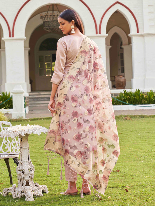 Dhiyona TI Women's Beige Solid Gota Kurta with Pant & Dupatta
