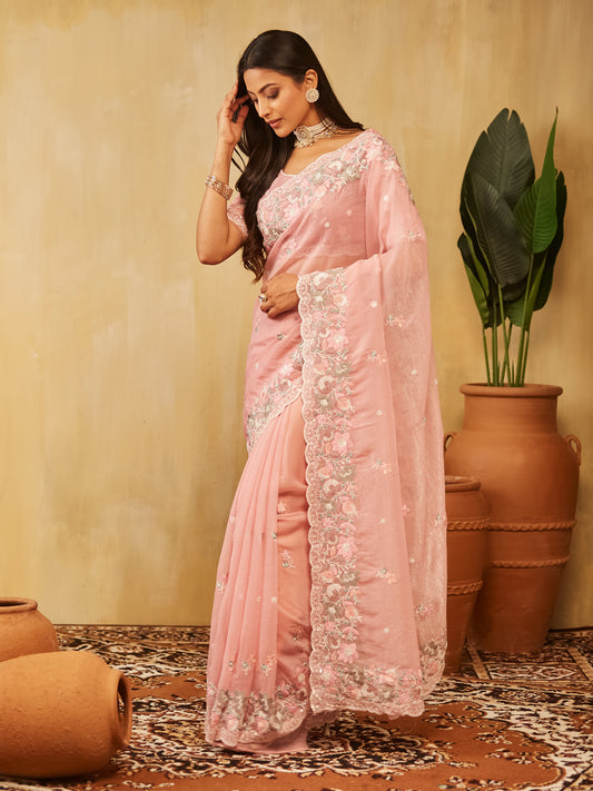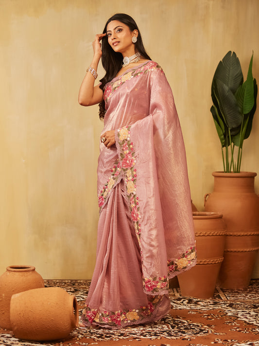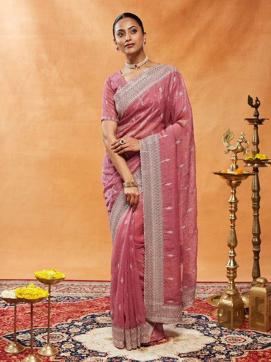 Dhiyona TI Women's Ready To Wear Pink Foil Embellished Saree with Unstitched Blouse