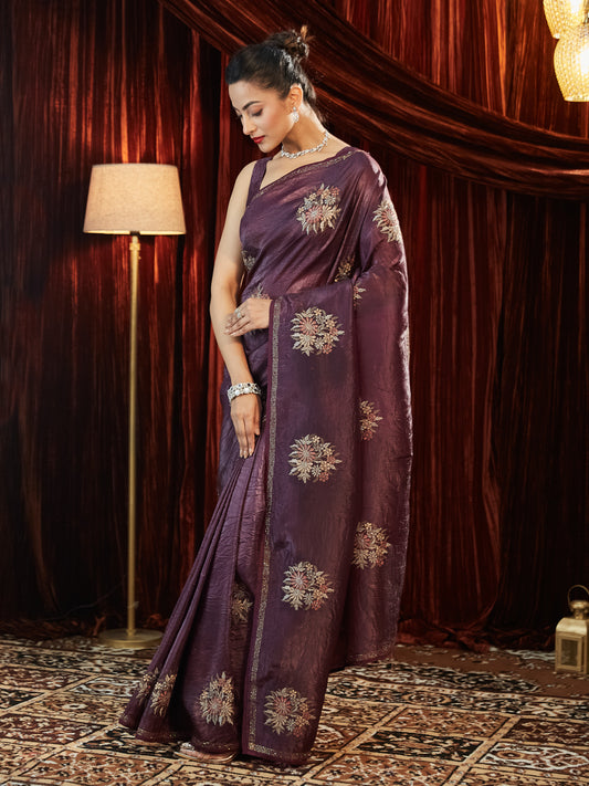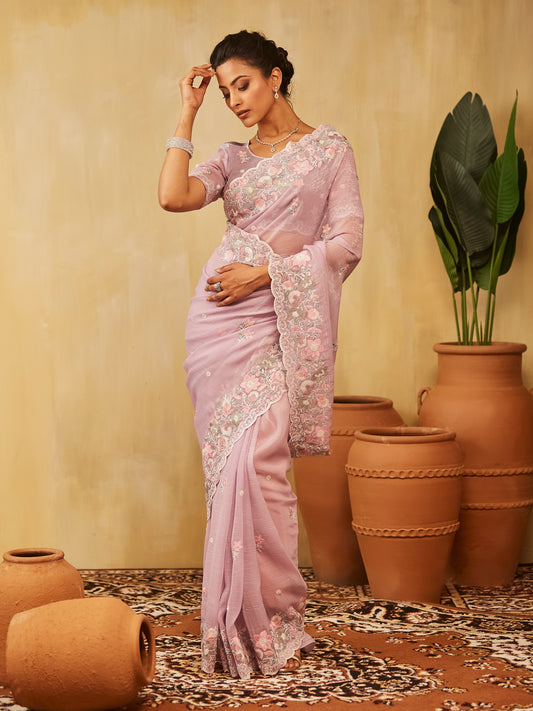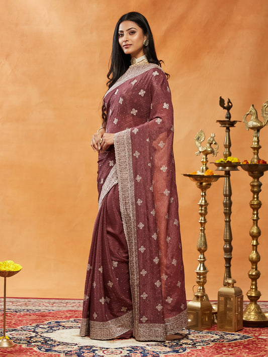 Dhiyona TI Women's Mauve Colored Net Embroidered Saree with Faux Diamonds with Unstitched Blouse