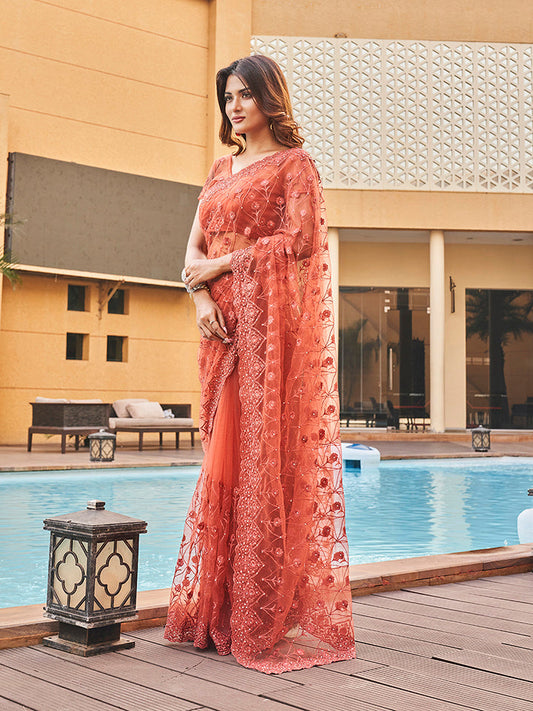 Dhiyona TI Women's Rust Colored Net Embroidered Saree with Faux Diamonds with Unstitched Blouse
