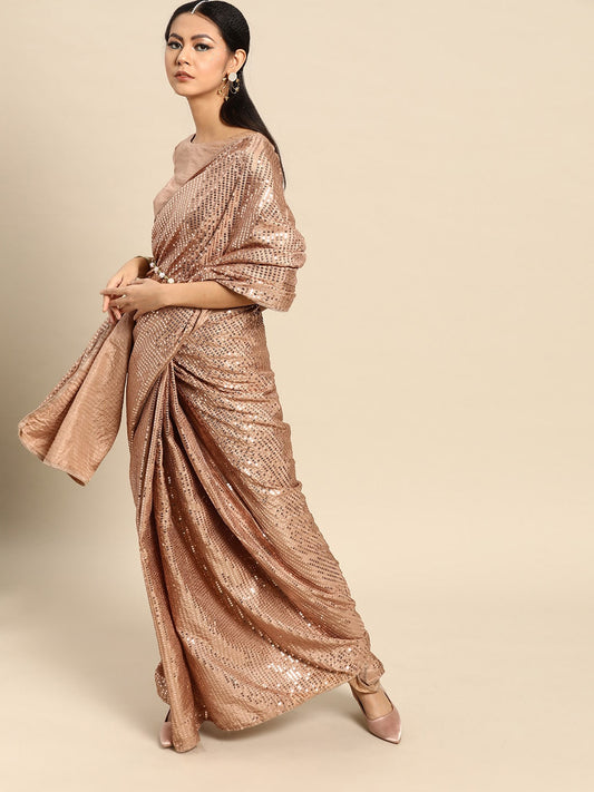 Dhiyona TI Women's Beige Crepe Sequins Saree with Unstitched Blouse