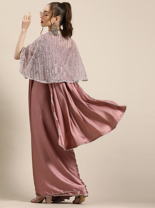 Dhiyona TI Women's Pink Soli Poly Satin Saree with Embellished Cape with Unstitched Blouse