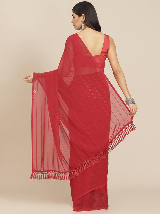 Dhiyona TI Women's Red Striped Polyester Saree with Tassels with Unstitched Blouse