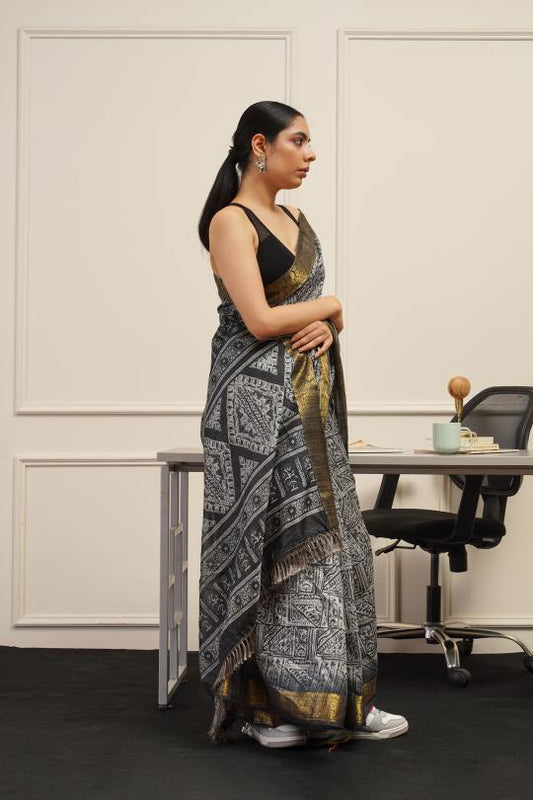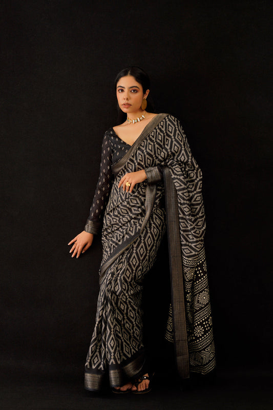 Dhiyona TI Women's Ready To Wear Black Ajarakh Block Printed Saree with Unstitched Blouse