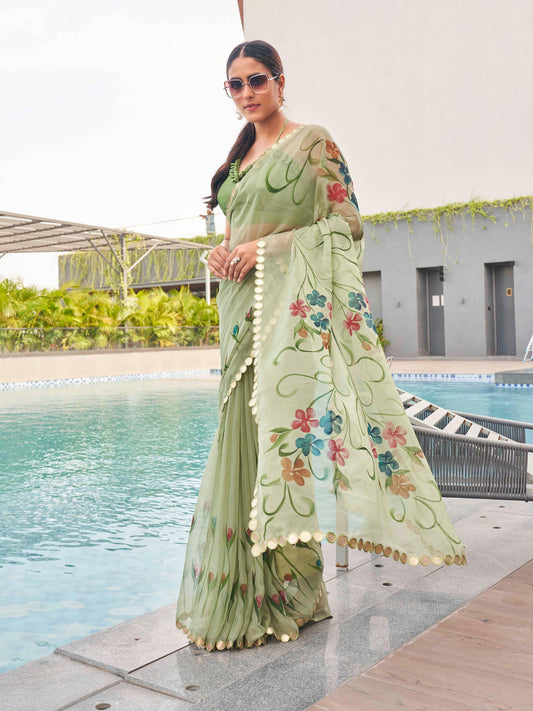 Dhiyona TI Women's Green Colored Hand Printed Chiffon Saree with Unstitched Blouse