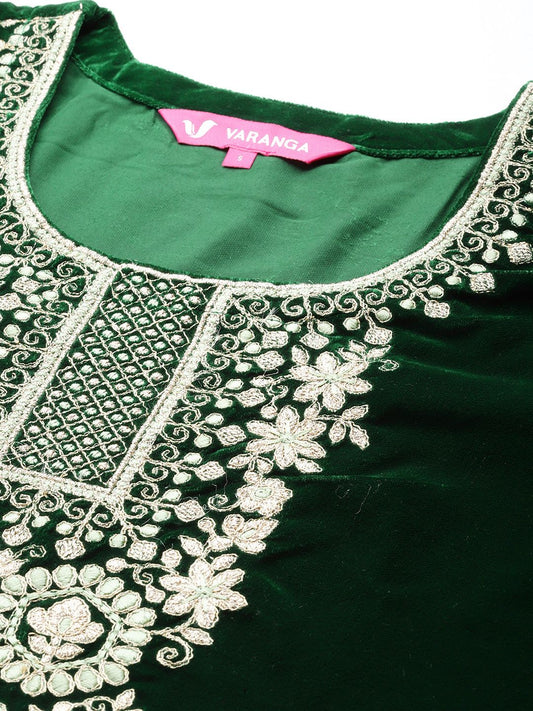 Dhiyona SO Women's Green Floral Embroidered Notch Neck Thread Work Velvet Kurta With Trousers