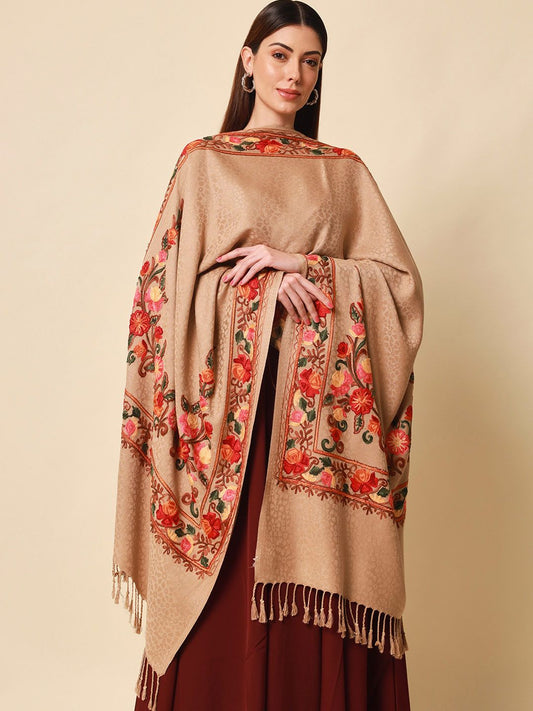 Dhiyona PA Women Beige Embroidered Pure Wool Shawl