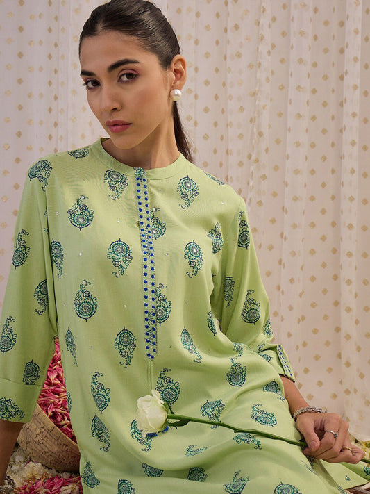 Dhiyona IE Green Floral Printed Mandarin Collar Straight Kurta