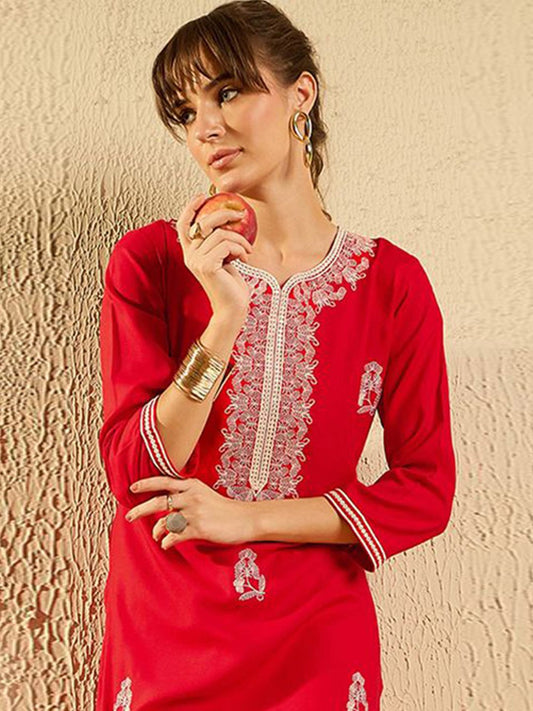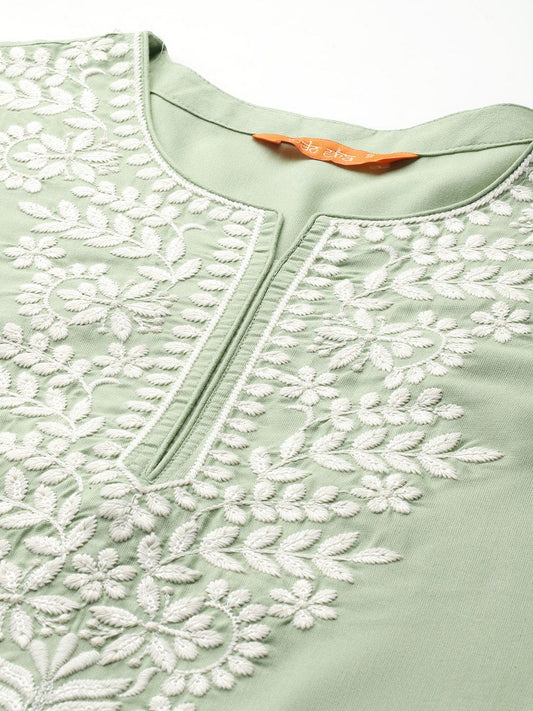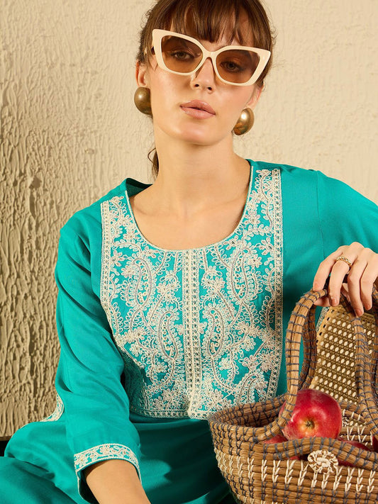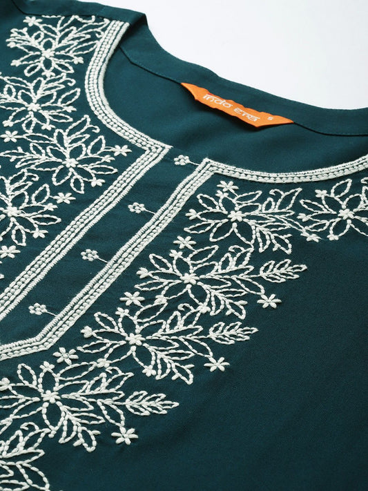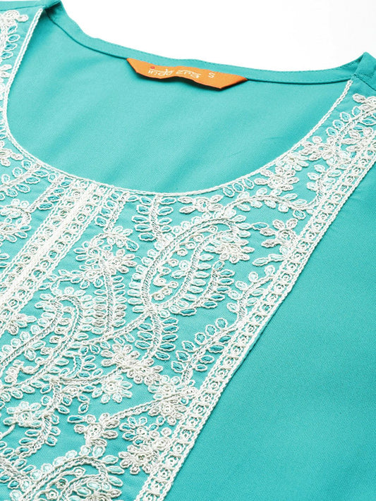 Dhiyona IE Ethnic Motifs Embroidered Notched Neck Thread Work Liva Straight Kurta
