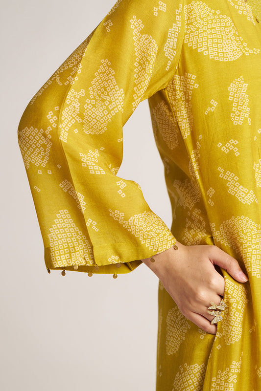 Dhiyona IE Bandhani Printed V-Neck Zari Silk Chiffon Straight Kurta With Trousers & Dupatta