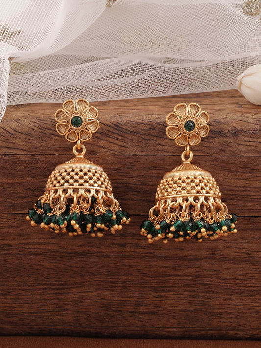 Dhiyona RJ Women's 18K Gold Plated Green Beaded Floral Motif Jhumka Earrings