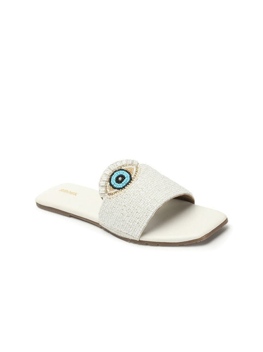 Dhiyona AK White & Blue Evil Eye Embellished Classic Open Toe Flats