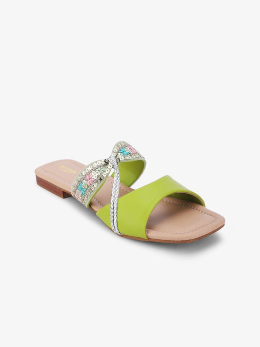 Dhiyona AK Green & Silver-Toned Embroidered Open Toe Flats
