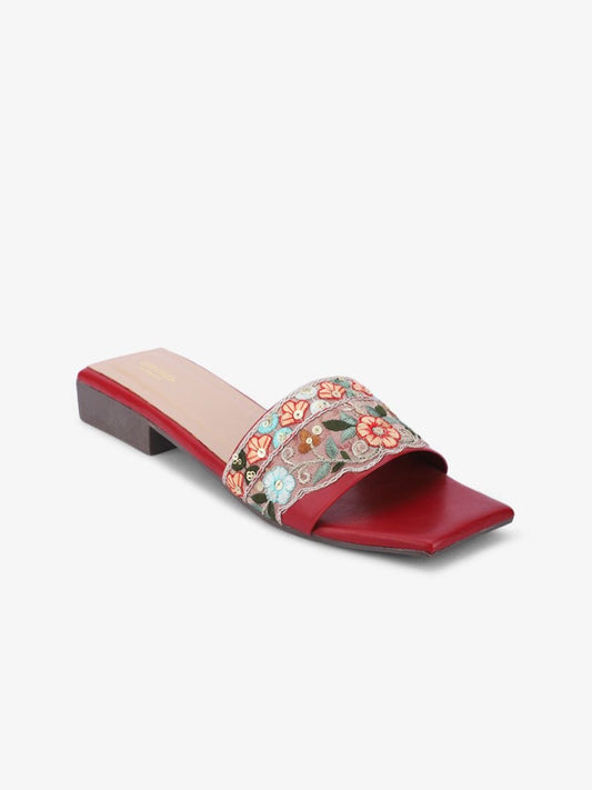 Dhiyona AK Red & Green Ethnic Embroidered Open Toe Flats
