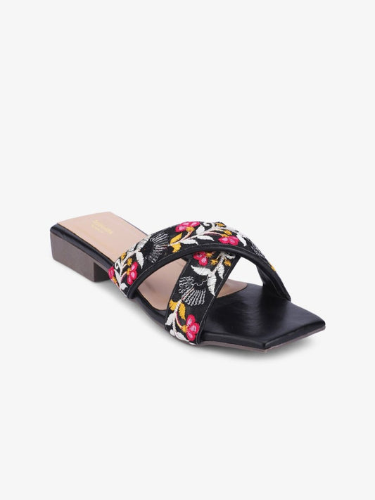 Dhiyona AK Black & Pink Embroidered Open Toe Flats