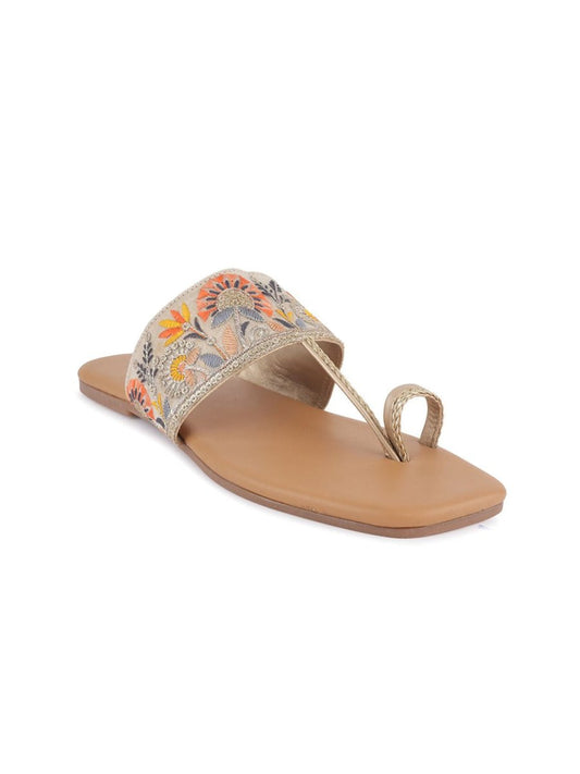 Dhiyona AK Tan Brown & Gold-Toned Embroidered Open Toe Flats