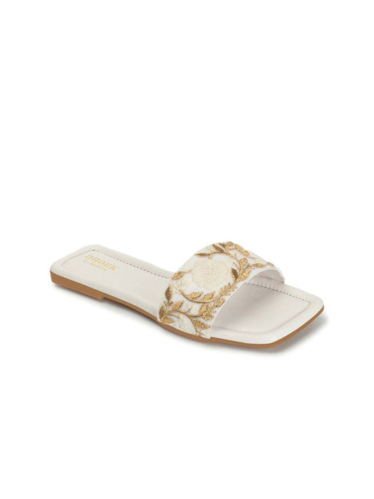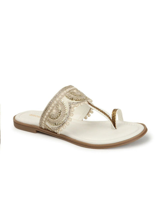 Dhiyona AK White & Gold-Toned Embroidered Open Toe Flats