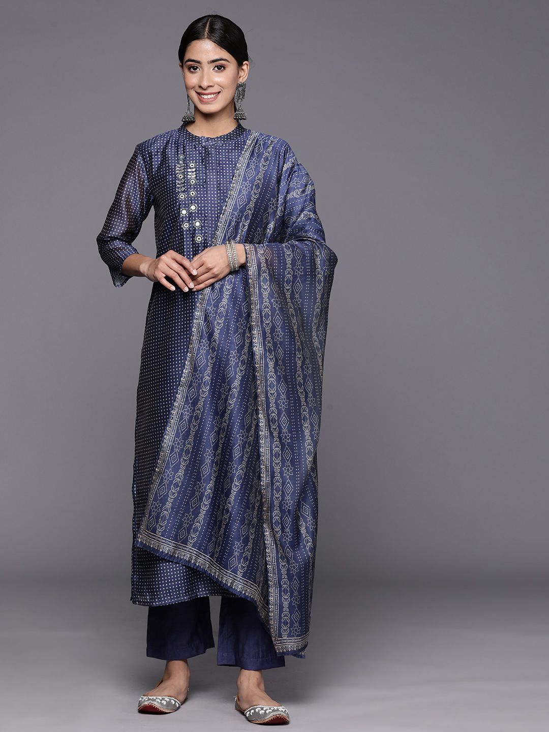 Navy blue printed Kurta with Trousers with dupatta