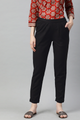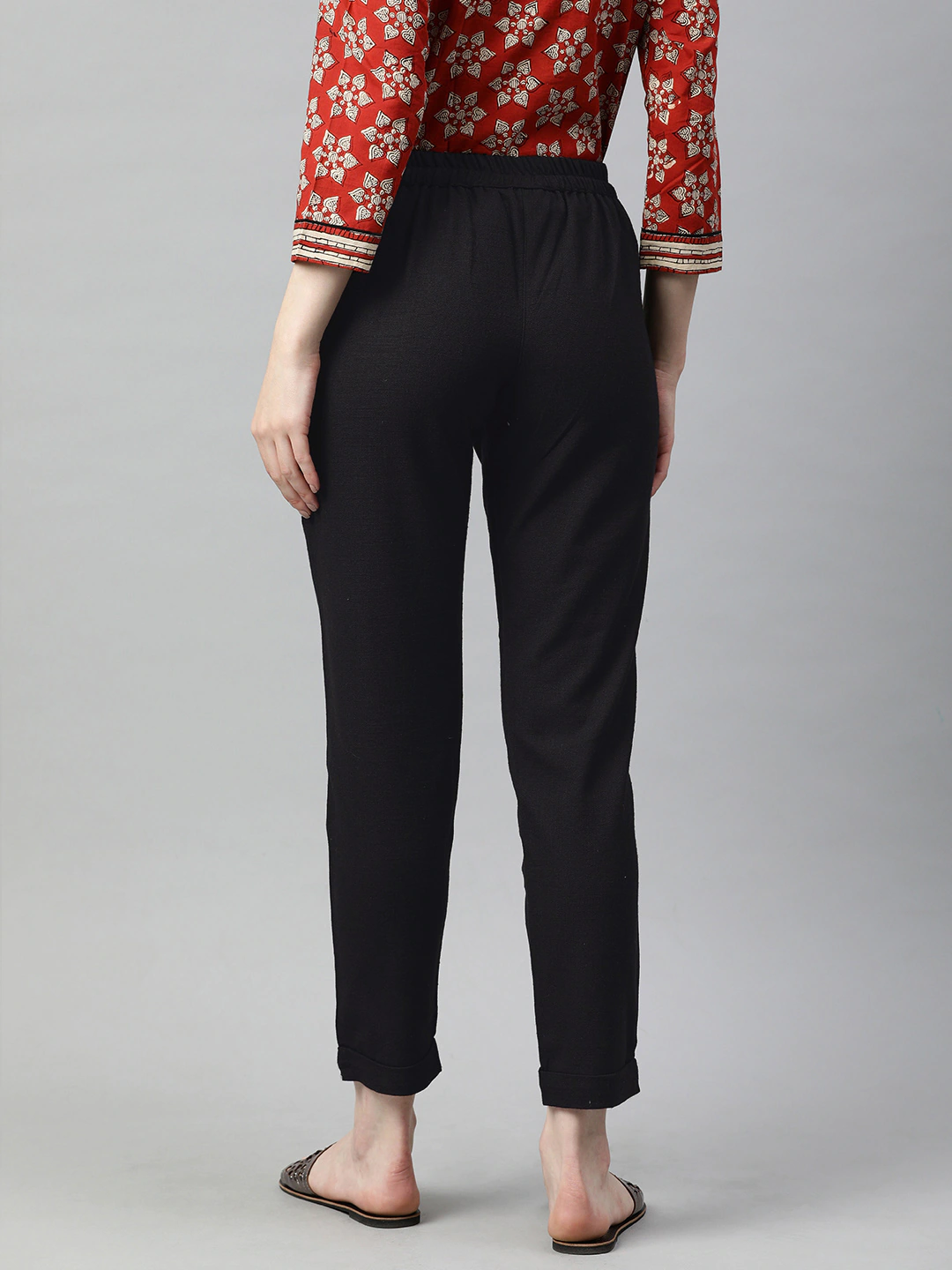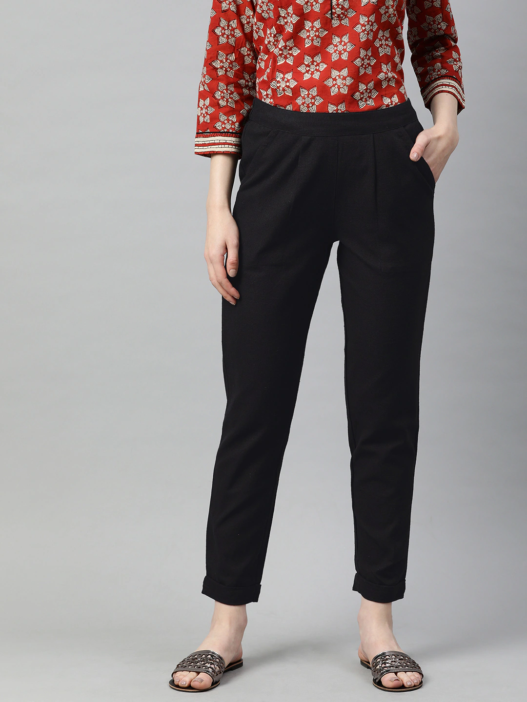 Black Mid Rise Plain Relaxed Cotton Slim Fit Pleated Trousers