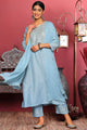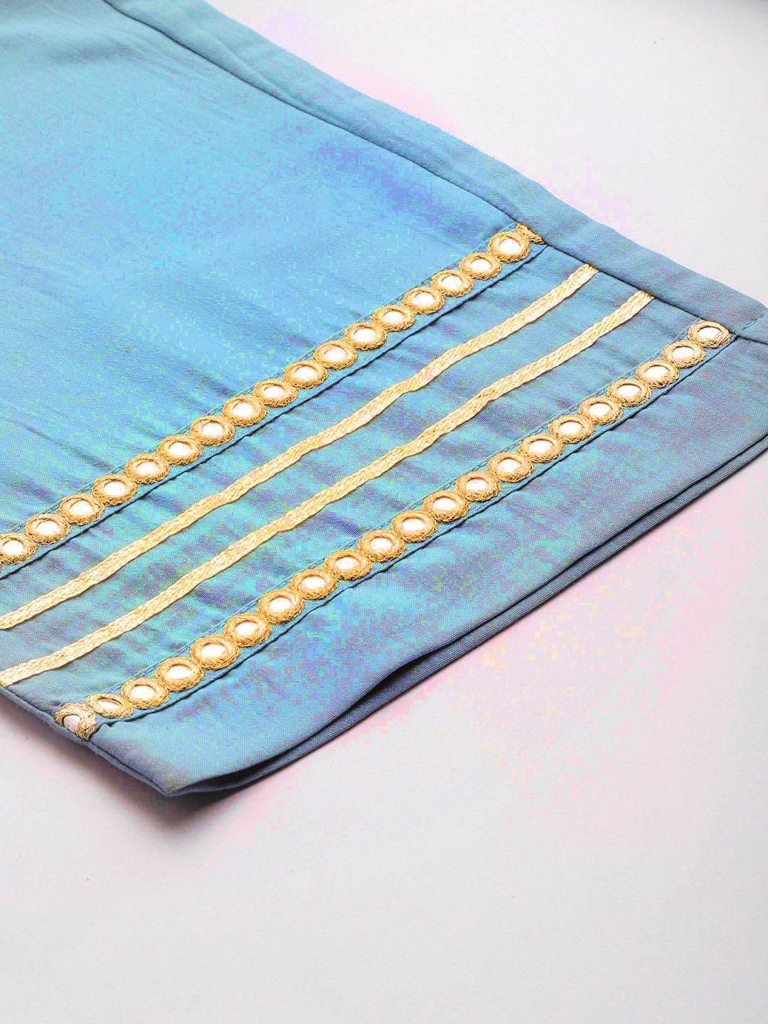 Blue & gold-toned floral embroidered mirror work straight kurta with trousers & dupatta