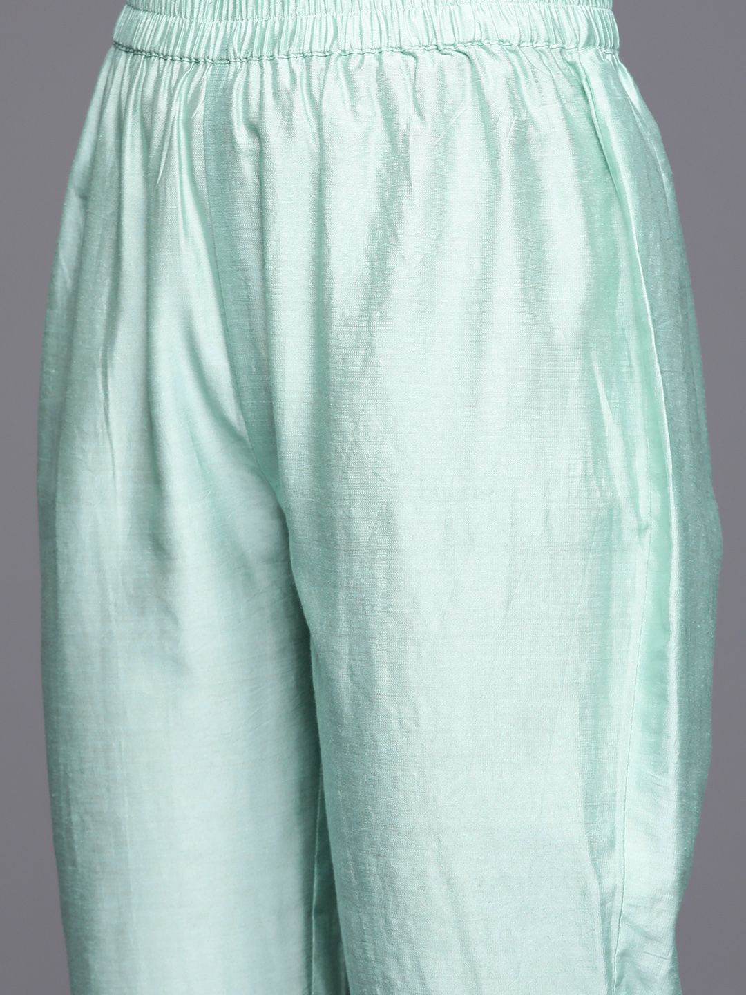 1 Kurta, 1 Trouser, 1 Dupatta Kurta: Fit-Straight Fit Color -Mint Green Print & Pattern-Stripper with Floral Neckline -Round with V Neck Sleeves -Three-Quarter Trouser Length - Calf Length Pattern- Solid Fit -Regular fit Waist- Elastic Dupatta: Pattern-Printed