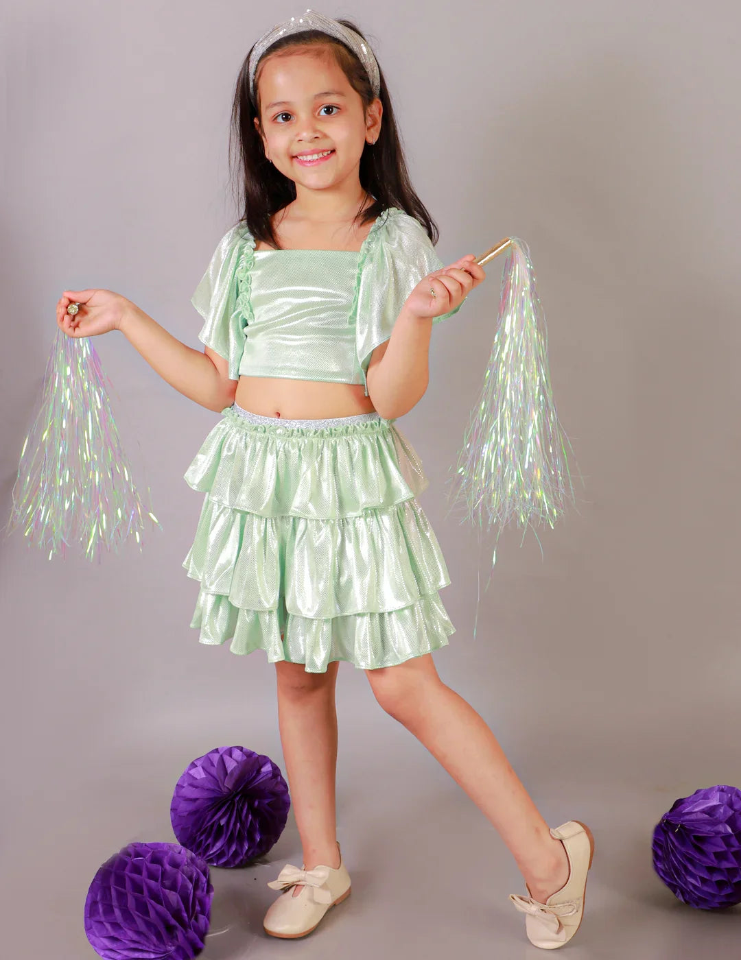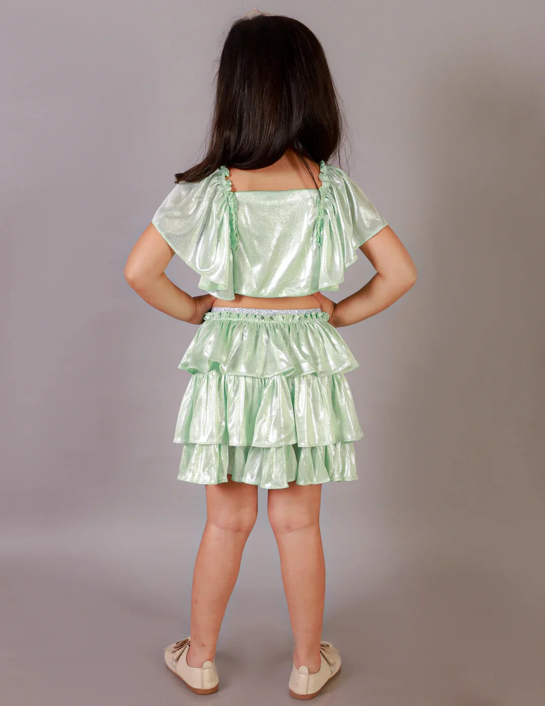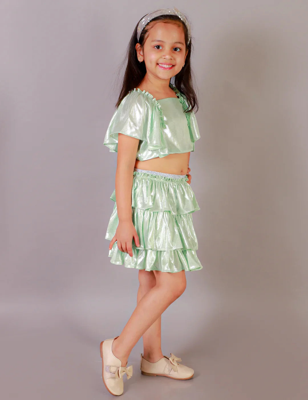 - Stylish foil-printed ruffle sleeve top paired with a tiered skirt for a chic look.