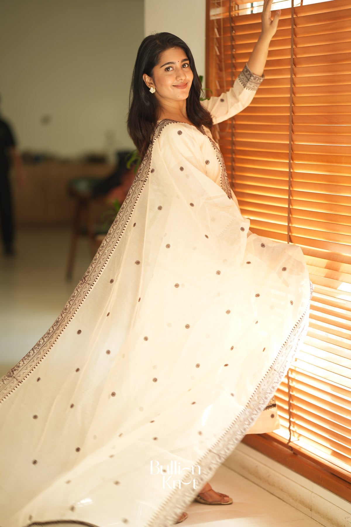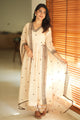 Step into timeless elegance with this Vanilla Kota Doria Naira Cut Kurta Set, a perfect blend of ethnic charm and contemporary flair. Made from airy Kota Doria fabric, this set ensures all-day comfort without compromising on sophistication. Designed in a flattering Naira cut silhouette, the kurta features intricate machine embroidery work—delicate motifs gracefully scattered across the body, and bold embroidered panels enhancing the sides and dupatta. The soft vanilla shade radiates subtle charm, making it a versatile pick for festive mornings, casual gatherings, or traditional celebrations. Embrace quality craftsmanship in a silhouette that’s both traditional and on-trend.