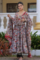 Explore yourself with a Mihika Anarkali Dress in a Beige. Its base is adorned with vibrant red, blue, and green floral patterns. The long flare of this Anarkali dress, combined with a subtle sweetheart neckline, adds a touch of feminine charm to the overall look. The full-length sleeves lend a graceful and refined appearance. This Anarkali dress is complemented by a matching dupatta with a red border that enhances its traditional appeal, This ensemble is perfect for festive gatherings or cultural celebrations. This beautiful Anarkali Dress pairs with statement earrings and embellished footwear for a sophisticated finish.